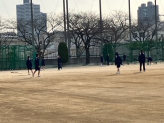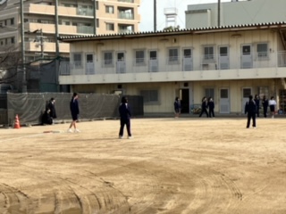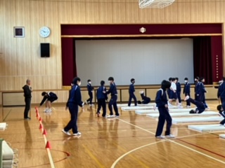 男子は体育館(マット運動)、女子は運動場(キックベースボール)でおこなっていました。