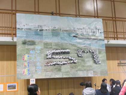 3枚目の写真は体育館に展示された1年生の学年展示です。1年生全員が力を合わせ、作成した淀川の河川敷の点描画です。一つ一つがさまざまな色の点で描かれています。