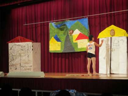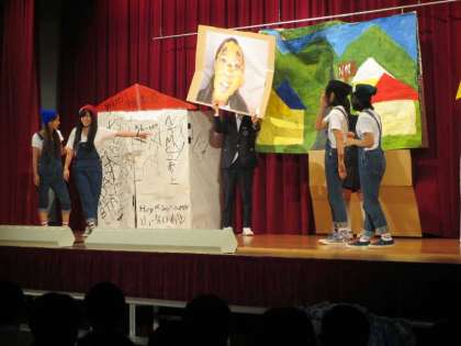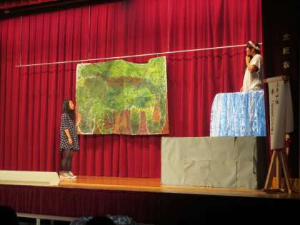 3年4組の劇「NAMMCOの泉」桃から生まれた少女のお話でした。
