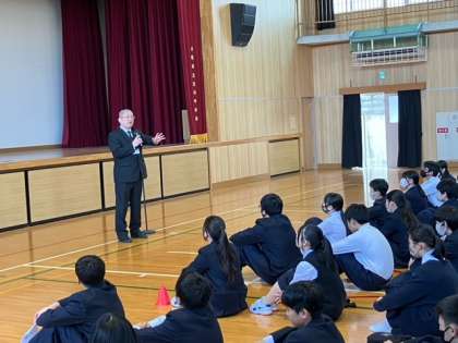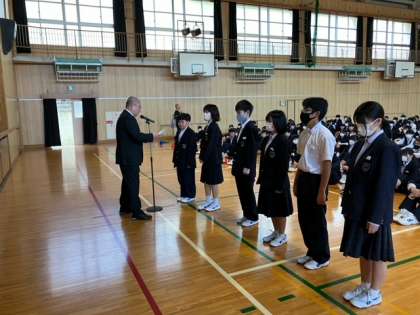 生徒指導主事の寺村先生からは、「新学期になって遅刻が減っている」とお褒めのことばと、「学校に学習に必要のないものを持ってこないようにしましょう」との注意がありました。