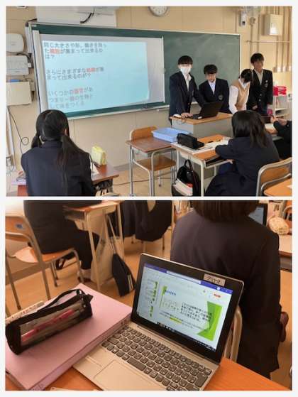 それぞれの班で作成されたスライドをもとに、生徒が生徒に授業をしあうスタイルで進められていました。
