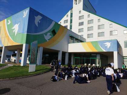 選択別体験活動が終わり、バスで本日の宿舎、ホテルレインボーに到着しました。