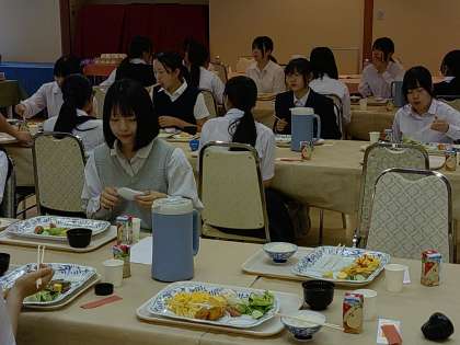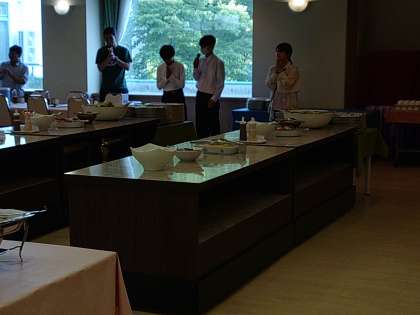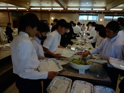 いただきますのあと、ちゃんと並んで料理を取っています。
