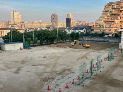 残土搬出を終え、もとテニスコートの復元、グラウンド東半分整地と工事はフィナーレへと向かいます