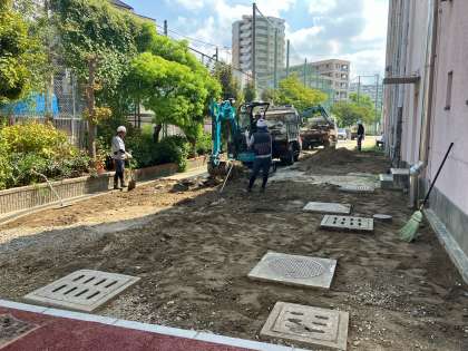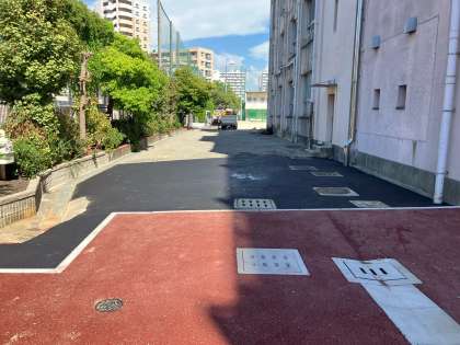 建替工事終了に伴い、未整備のままになっていた北館北側部分(正門から通用門の間)をきれいにアスファルト舗装をしていただきました。