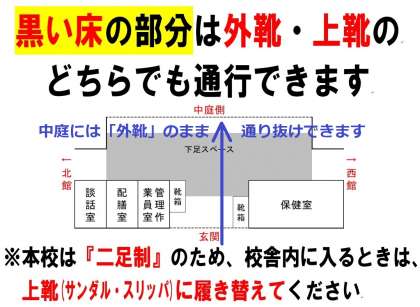 2.「玄関の黒い床」および「屋根のある渡り廊下」は外靴、上履きのどちらでも通行可