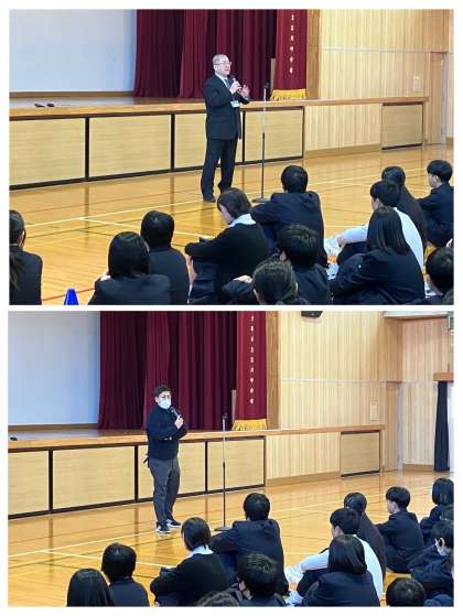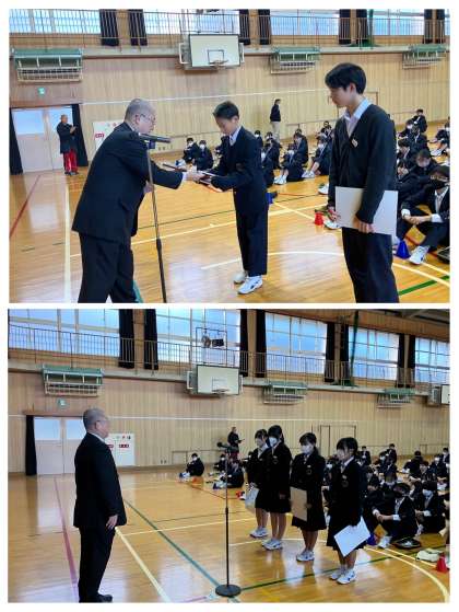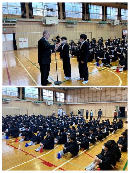 〇生徒指導主事 寺村先生からは「学校のルールを守る」「登下校中の交通ルールを守る」「懇談期間中の午後の過ごし方」について、お話がありました。