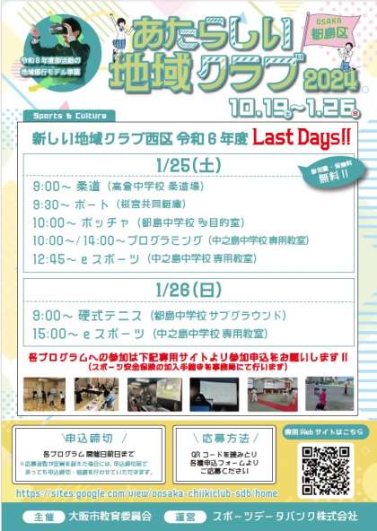 さて、現在大阪市の取り組みとして行っている「新しい地域クラブ」の開催におきまして、第5弾のチラシ及び案内がありましたので、チラシデータの送付をさせていただきます。