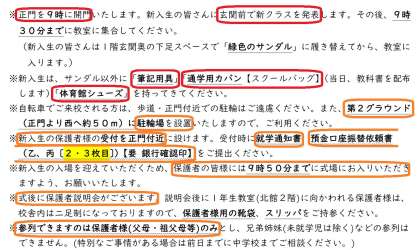 校区小学校の本校入学予定生へは、小学校卒業式までに小学校からお子さまに紙のプリントでもお渡しいたしました。