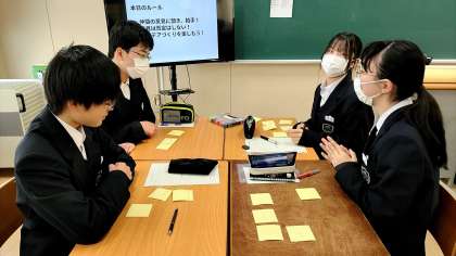 常翔学園高等学校から花本先生、樋口先生に来ていただいて、出前授業を行っていただきました。企業体験学習ということで様々なアイデアやキーワードを出して楽しくグループワークを行っていました。