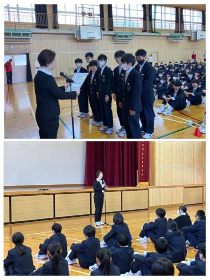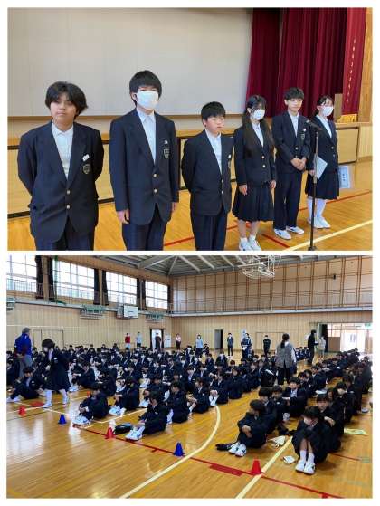 今年度最初の全校集会です。毎週月曜日の朝は全校集会です。