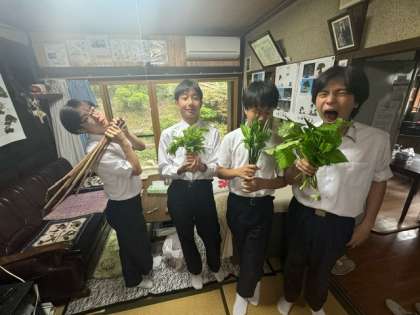 和紙漉き体験や収穫した山菜との写真です。