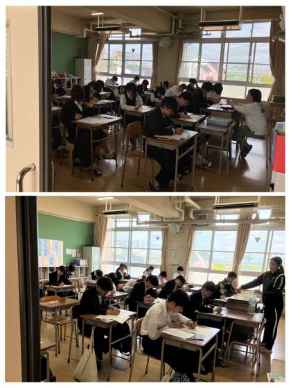 写真は3年1組、3年2組、3年3組のテストの様子です。