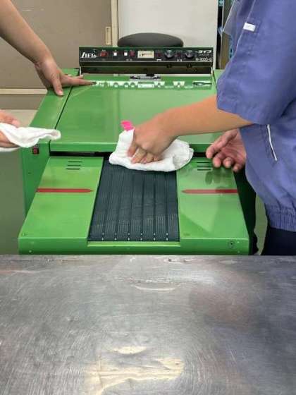 おしぼり包装機、ゴミ落とし機など初めて目にする機械もたくさんあります。