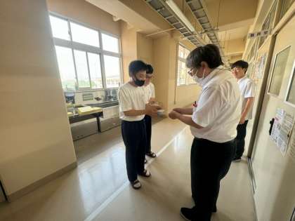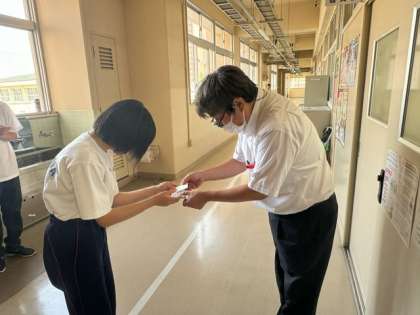 自分で作ってきた名刺を使って、教頭先生と名刺交換を行いました。言葉遣いや渡し方等学んできたことを生かしてできていました。