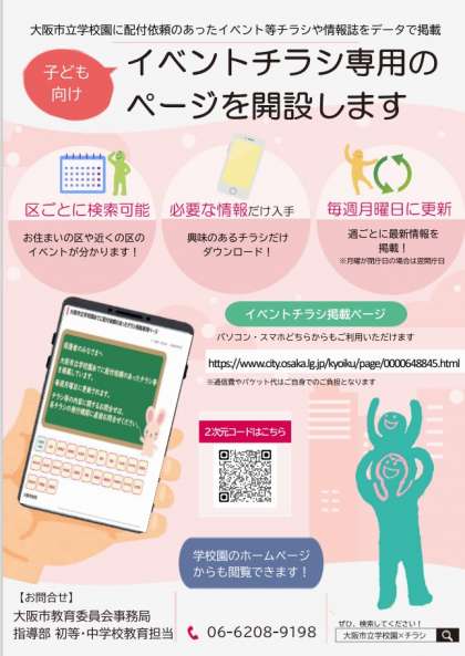大阪市立の学校園では、これまで団体等から配付依頼のあったイベント等のチラシや情報誌等を子どもたちへの配付を通じてお知らせしておりましたが、このたび、個別配付を取りやめ、データによる掲載へ移行することにいたしました。