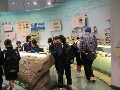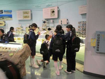 生徒たちは、琵琶湖周辺の遺跡や琵琶湖に住む生物などの展示物を見たり、説明文を読んだり、興味深く見学していました。