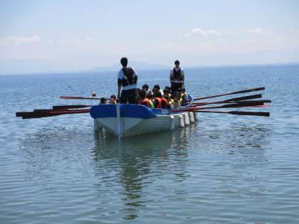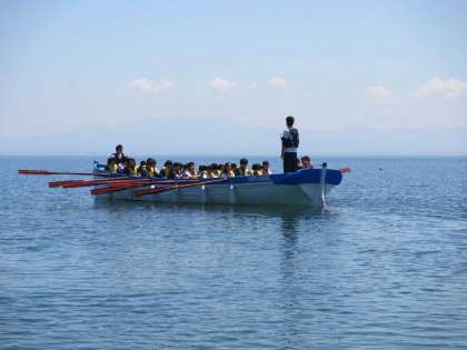 最初は片側に寄せられているオールの一方を立てなければなりません。しかし、立てるとバランスが悪く、注意をしないと倒れてしまいます。みんなの協力と息があってなくてはうまくいきません。