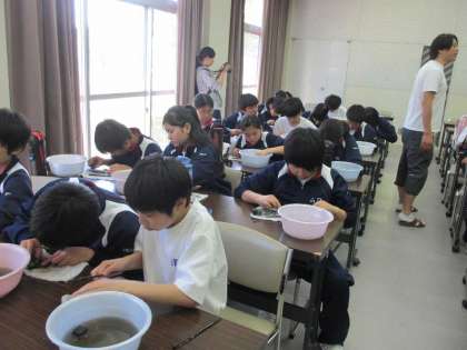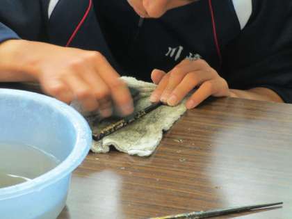 カッターは一度に全員が乗船できず、前後半とし、その間カッター乗船以外の生徒たちは若狭塗ばし作りを体験しました。幾重にも塗られた漆をやすりで削り、中に埋め込まれた貝殻を浮かび上がらせ、模様をつけるというものです。