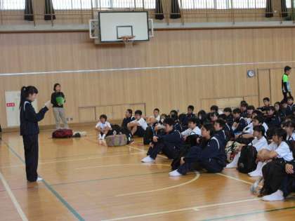 カッター実習、若狭塗りばし体験を終え、食堂で牛丼の昼食をいただき、体育館で退所式を行いました。生徒代表がお礼の言葉を館員の皆さんに述べ、館員の代表の方からお話をいただきました。
