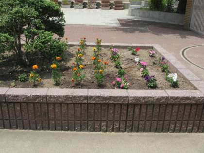 写真は管理作業員が校門内の植え込みに花を植えてくれました。生徒たちを花々が迎えてくれています。