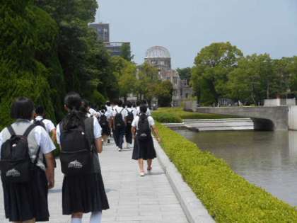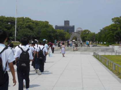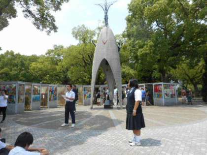 写真は慰霊碑と生徒たち、原爆ドームと生徒たち、原爆の子の像の前で自ら文章を作成し、平和へのメッセージを述べる生徒代表です。その後生徒たち全員で作成した千羽鶴を捧げました。