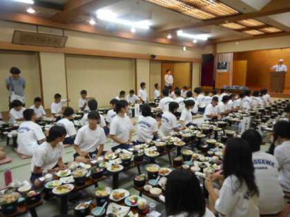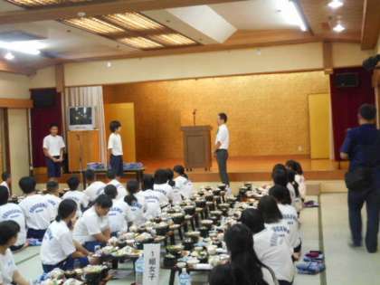 写真は「宝荘」玄関、食事の際の生徒あいさつ、最後は料理長の和食講座です。料理長が今日の料理を説明、さらに日本料理のマナーについてもお話してくださいました。
