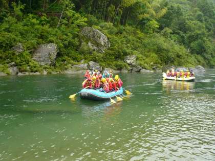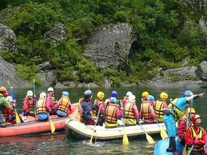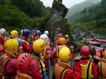 次は今回の修学旅行で生徒たちが最も楽しみにしていたラフティングです。松山市内から2時間バスに乗り、吉野川に到着し、早速ウエットスーツにライフジャケット、ヘルメットを身につけ、係員の方の説明も待ち遠しく、準備万端ボートに乗り込みました。
