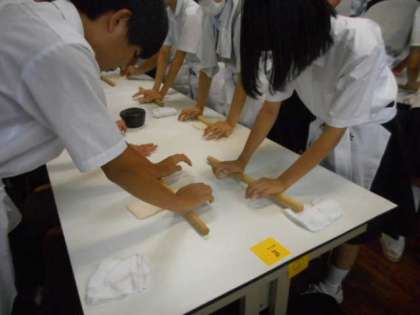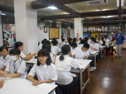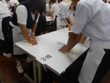 3日目は金刀比羅宮を訪れました。まずは中野うどん学校で、うどん打ちを体験しました。最初は全員で、すでに粉に水を混ぜたうどん玉を麺棒で伸ばし、切る作業を体験しました。