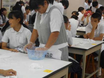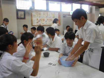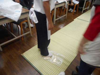 次に各班単位で、粉からうどん作りを体験しました。ボールの中の粉に塩水を入れ、手でこねます。手に引っ付いて、なかなか一つにまとまりません。さらにビニールの間に種を挟み、足で踏んでこしを出します。
