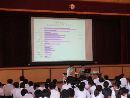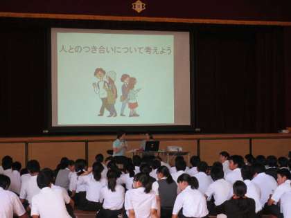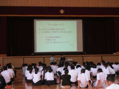 5限目、体育館で3年生性教育を行いました。「人とのつき合いについて考えよう」ということで、異性との付き合いについて考えました。正しい男女交際について考える授業でした。