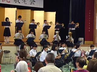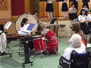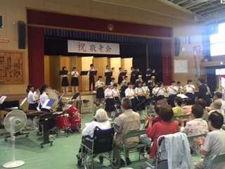 9月19日(祝)敬老の日に、大東小学校で大東地区の敬老会が行われ、式典の後、本校吹奏楽部が演奏いたしました。たそがれコンサートの次の日ということでしたが、部員たちは元気いっぱい演奏し、敬老会に花を添えていました。