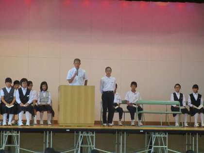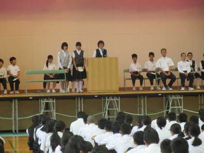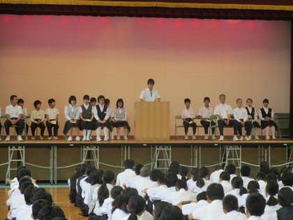 今日、午後体育館で生徒会役員選挙立会演説会を行いました。現生徒会の進行で、会長あいさつ、選挙管理委員長の説明がありました。そのあと、生徒会長、男女副会長、執行役員4名の候補者が演説を行い、またそれぞれの応援者から応援演説がありました。今回は対立候補がなく、全員が信任投票になります。
