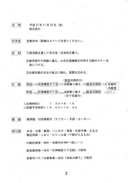 2年生は明日、11月18日(金)校外学習で京都方面に出かけます。各クラス6〜7名の6つの班に分かれ、学校出発から帰校するまで、全て班で行動します。そのため班の集合時間は7時30分から8時までの間で異なり、諸注意後出発し、8時15分には全員が出発します。各班ごとに集合時間に遅れないよう、事前確認を忘れないようにしてください。