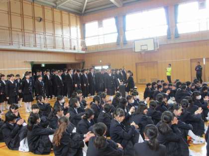 今日6時間目、体育館でお別れの会を行いました。来週3月14日(火)は卒業式ですが、1・2年生は学級委員のみの参加となります。全員で3年生を見送る会として、お別れの会を行いました。1・2年生代表の送る言葉の後、1年生合唱、2年生合唱と続きました。
