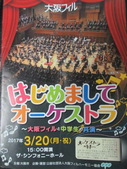 昨日、3月20日(祝)ザ・シンフォニーホールで大阪フィルによる演奏会が行われましたが、この演奏会の第2部では大阪市の中学校生徒の参加による演奏が行われました。市内15校の生徒が参加しましたが、本校吹奏楽部の生徒たちも参加しました。