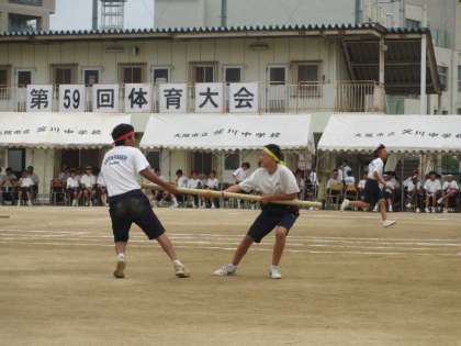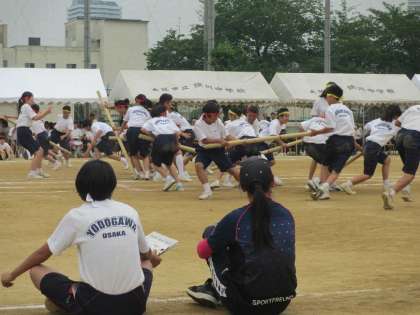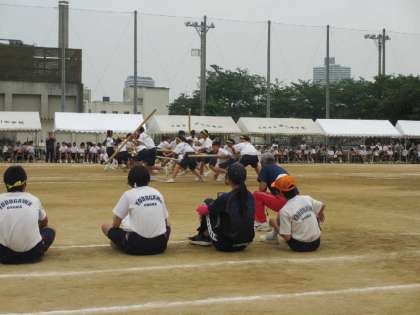 棒〜とすんな、各クラス男女混合で学年対抗で行いました。グランド中央の竹の棒を取り合います。なかなかの迫力でした。