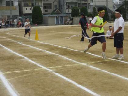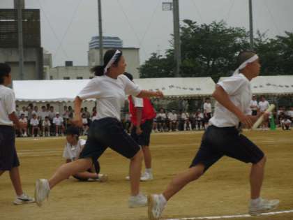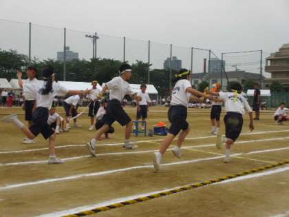 次スエーデンリレーです。各クラ7名の生徒たちが最短75メート、最長300メートルの距離を走りました。