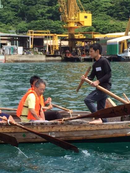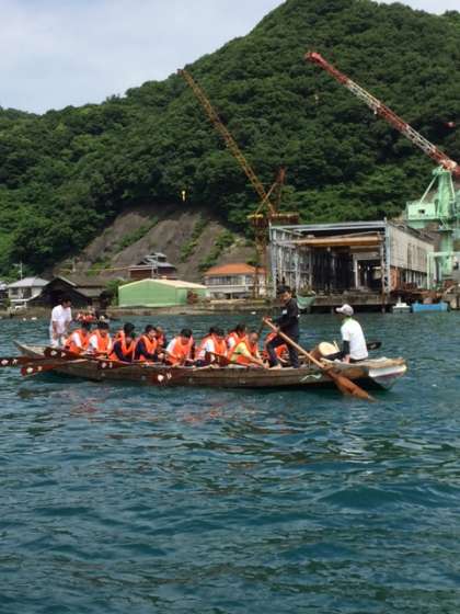 お天気もよくなり、3年生は救命胴衣を装着し準備万端、櫂伝馬競漕のために漕ぎ出していきます。ある船には、校長先生も乗り込まれ、競漕に参加されました。その勇姿をご覧ください。