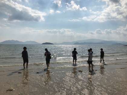 淀川中学校3年生はそれぞれ民泊先に分かれて出発しましたが、宿泊先のお仕事を手伝う中で浜辺にやってきた生徒たちが小休止でしょうか、波と戯れています。泳ぐにはまだ早い海ですが、気持ちよさそうに楽しんでいます。