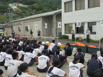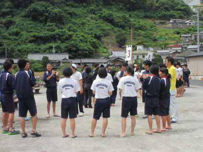 大崎上島に着き、櫂伝馬体験を行いました。最初に地域協議会の事務局長の方からあいさつをいただき、櫂伝馬についてお話をしていただきました。櫂伝馬は14人の漕ぎ手の他、舵を取る者、漕ぎ手の息を合わせるため太鼓を打つ者が乗ります。