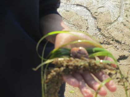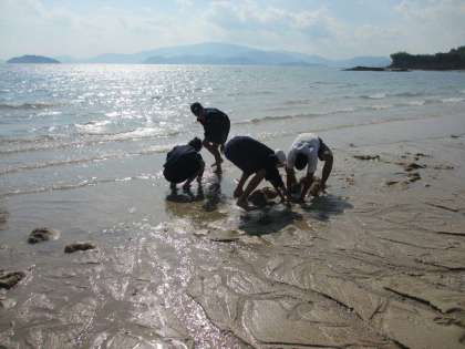 海岸では潮干狩りをしていましたが、なかなか貝を見つけることができません。やっとハマグリらしき貝を発見!