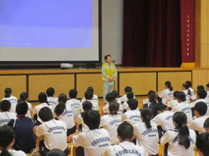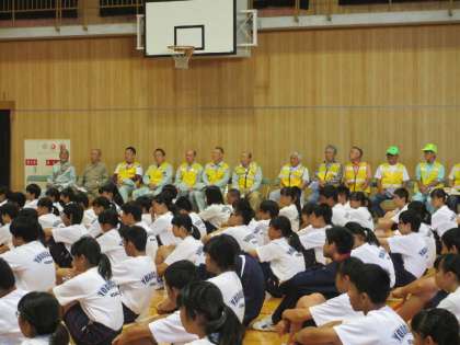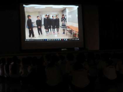 写真は地域代表、淀川連合町会長の外村様のごあいさつと地域の皆様です。さらにDVDを鑑賞する生徒たちです。