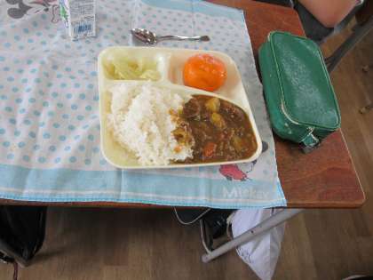 今日の給食はカレーライスでした。副食としてキャベツのピクルス。デザートに冷凍みかん。そして牛乳でした。