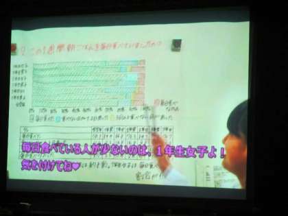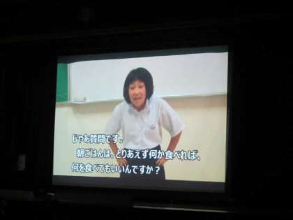 整美委員会の発表を行いました。「朝から元気いっぱいな人たちの不思議」と題して朝ごはんの大切さを探偵ナイトスクープ風にビデオで表現しました。なかなかの力作でした。