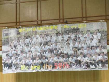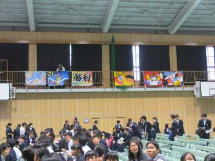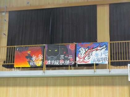 体育館のギャラリーには1年生全員による点描画が展示されていました。また、体育大会で各クラスが作成したクラス旗も展示されていました。
