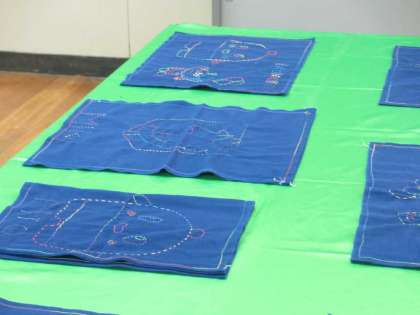 続いて家庭科作品、1年による「刺し子ランチョンマット」、2年生「食べ物新聞」です。