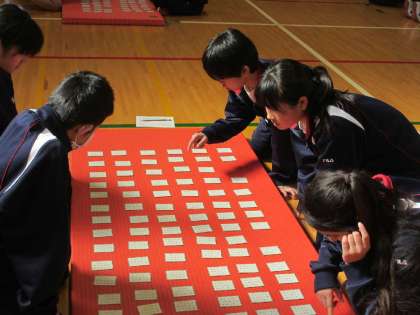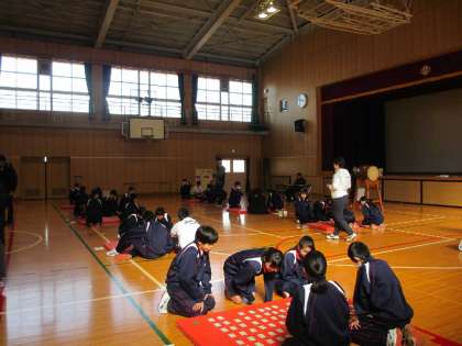 今日5・6限目に1年では、体育館で百人一首大会を行いました。昨日までインフルエンザのため学級休業でした1年2組の生徒たちも元気に参加していました。