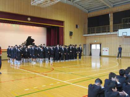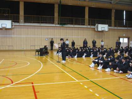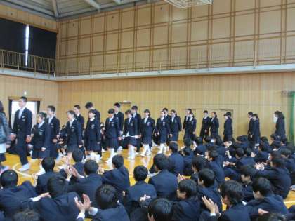 今日6限目、体育館で卒業生を送る会を行いました。1・2年生が花道を作り、3年生を迎えました。そして、学校長の言葉、生徒会代表がお祝いの言葉を述べました。