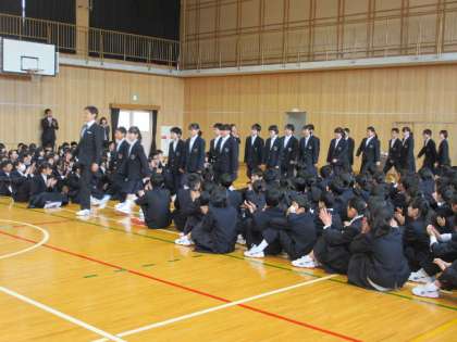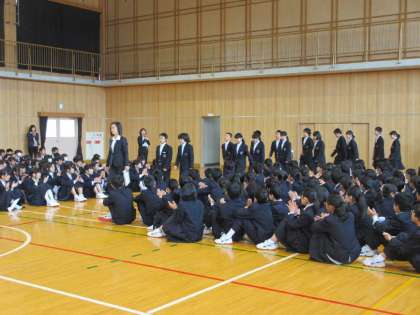 写真は対面式のようすです。2・3年生が1年生を迎えました。